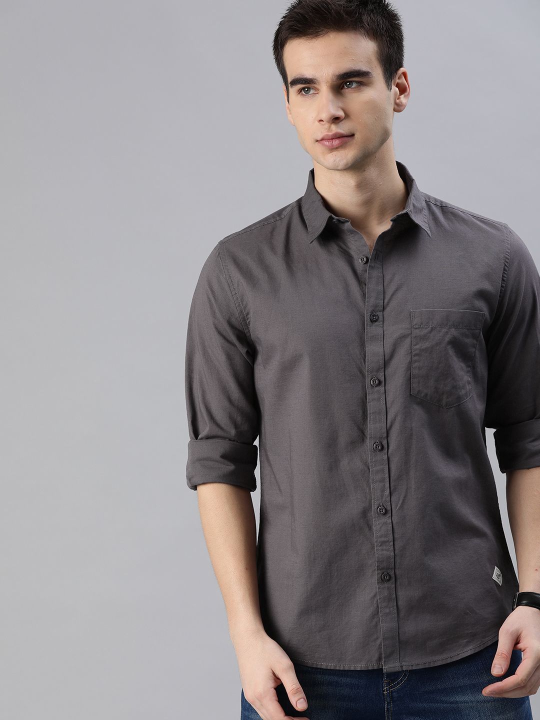 Charcoal solid casual shirt, has a spread collar, long sleeves, button placket, curved hem, and 1 patch pocket